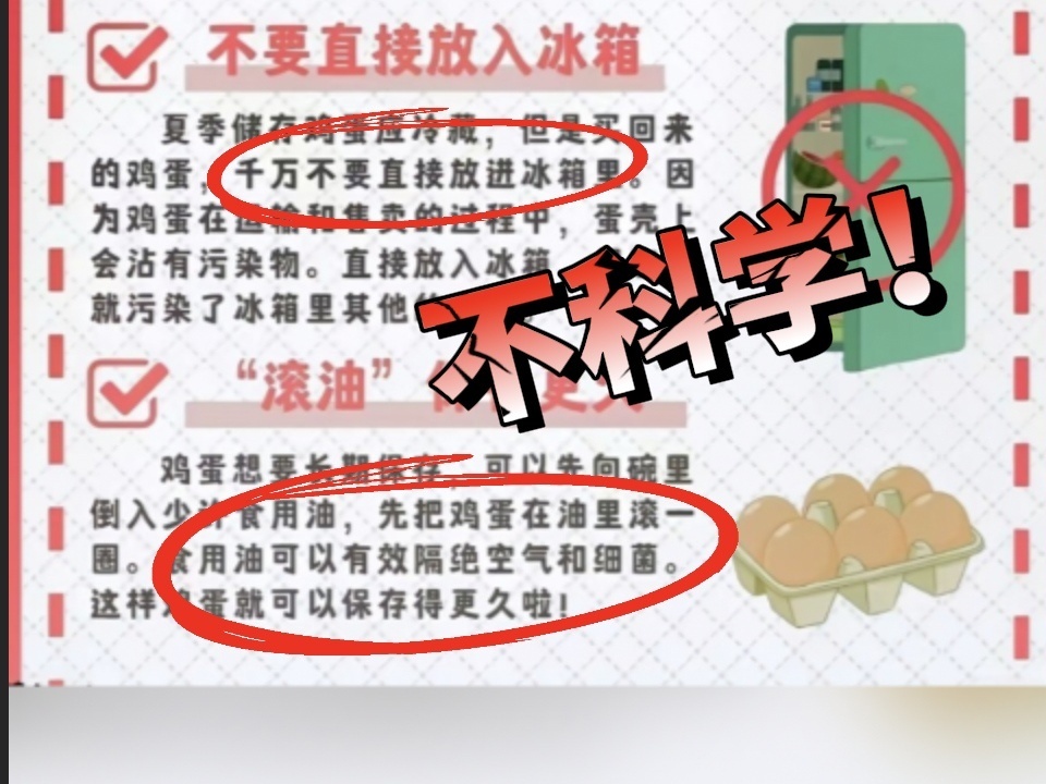 艾民珉呼吁消费者要购买正规生产的有安全保障的鸡蛋,不要购买路边没有标识的鸡蛋。工厂鸡蛋的洁蛋步骤很重要,鸡蛋更不容易变质。另外,针对“滚油可以有效隔绝空气和细菌保存更久”的说法,艾民珉告诉记者,“滚油”有一定作用但没必要,不如放冰箱储存的效果明显,并且很多鸡蛋出厂时已洁蛋,不需过度担心。